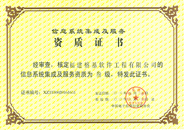 经中国电子信息行业联合会评定,近日,榕基软件全资子公司福建榕基软件工程有限公司获得该联合会颁发的信息系统集成及服务三级资质证书。信息系统集成及服务资质评定,考查了相关企业的综合条件、财务状况、信誉、业绩、管理能力、技术实力、人才实力等方面情况,此前,福建榕基软件工程有限公司已通过GB/T 19001-2008 idt ISO 9001:2008质量管理体系认证,获得福建省科学技术厅、福建省财政厅、福建省国家税务局、福建省地方税务局联合颁发的福建省高新技术企业证书。目前,福建榕基软件工程有限公司已拥有计算机软件著作权20余项,正持续致力于技术研发、项目建设、质量管理及客户服务等方面水平的提升。